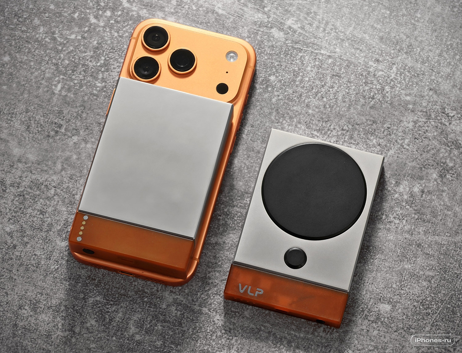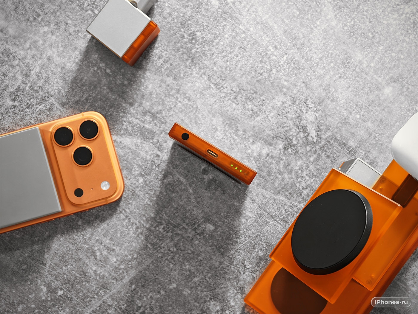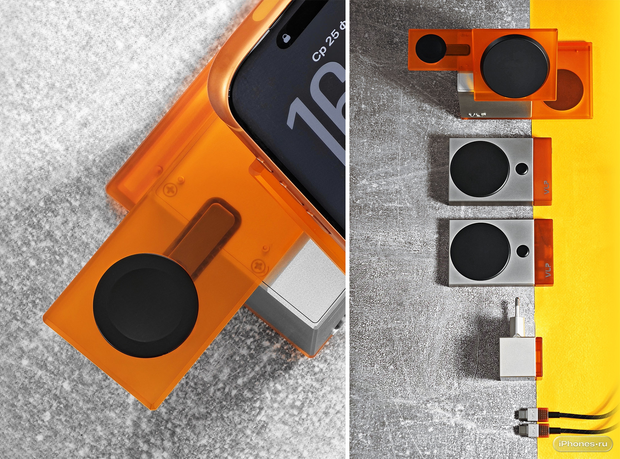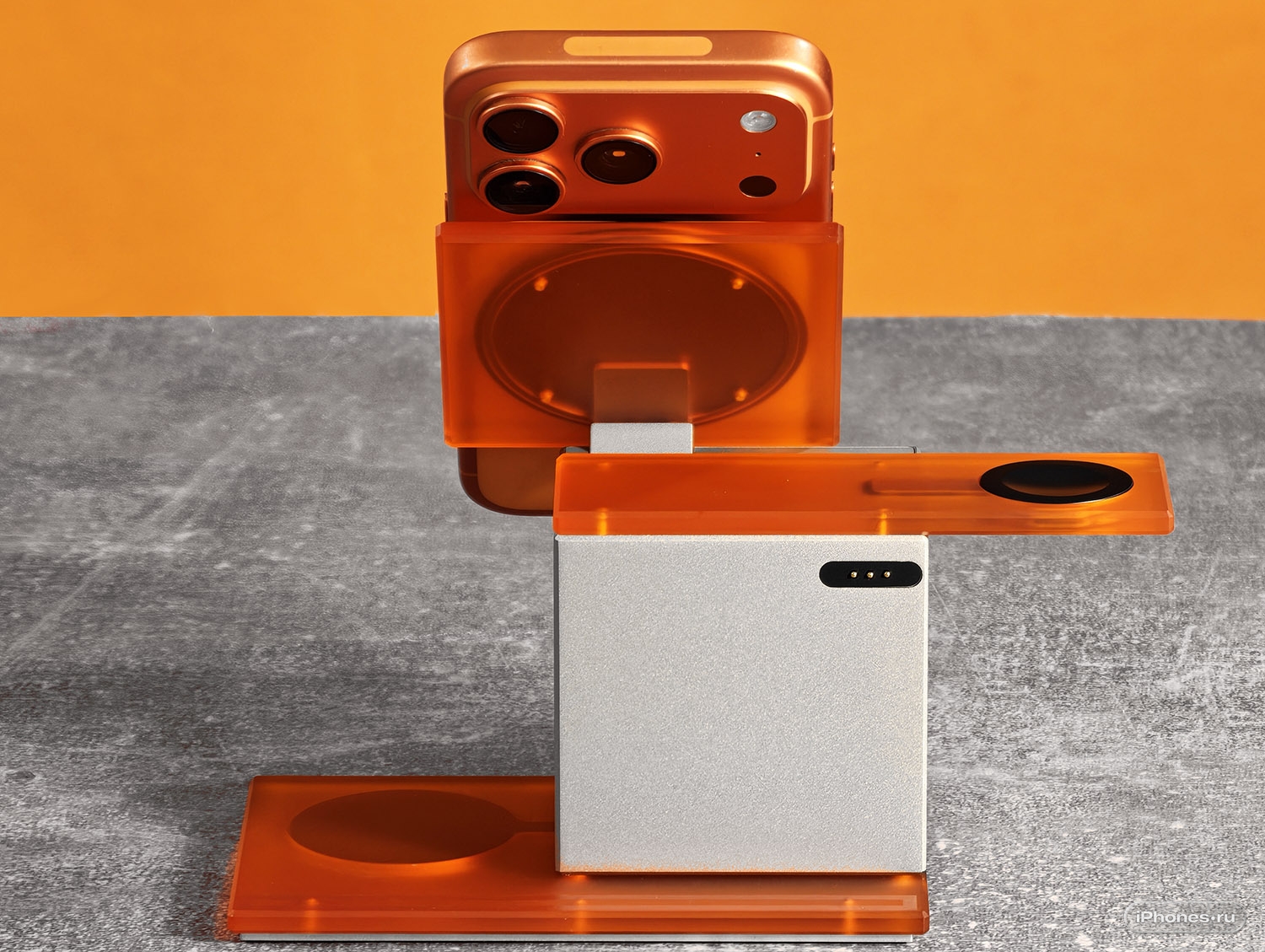 Основной блок станции сделан из цельного куска алюминия, обрамлённого прозрачными поликарбонатными панелями всё в том же оранжевом цвете. iPhone крепится к зарядке Qi2.2 (до 27 Вт) с регулировкой угла наклона.