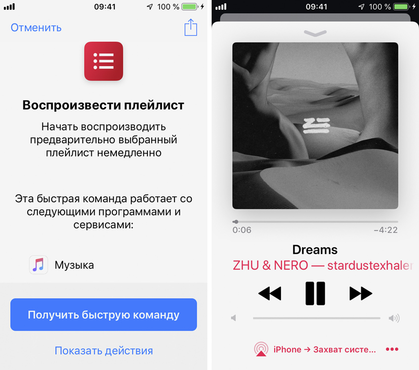 Я использовал команду «Воспроизвести плейлист». Добавил в нее избранный список и фразу для Siri «Я в машине».