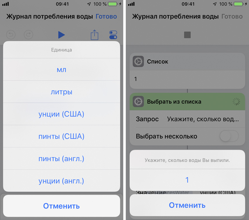 Когда добавите эту команду из галереи, настройте ее работу: выберите варианты объема воды в меню «Список» (после активации команды у вас будет выбор), а также единицы измерения в строке «Значение».
