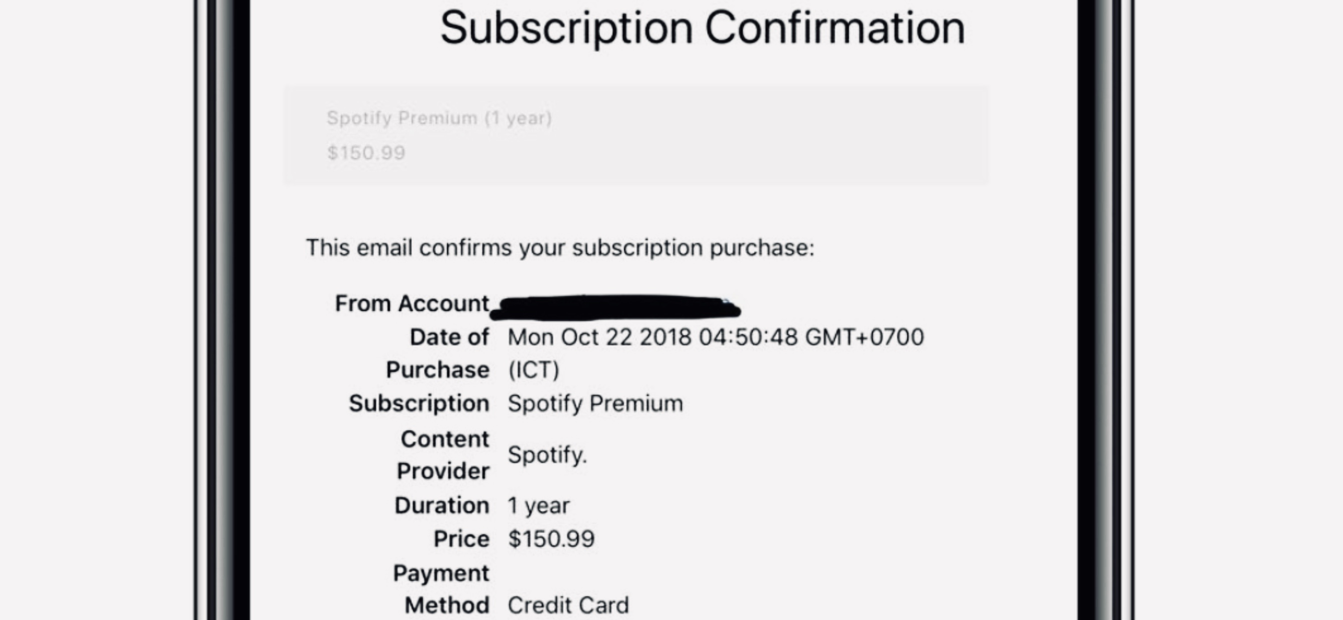 Выглядит схема достаточно просто. Вам на почту приходит сообщение якобы от Apple, в котором говорится, что вы купили премиум-подписку на какой-нибудь сервис. Чаще всего, на Spotify.