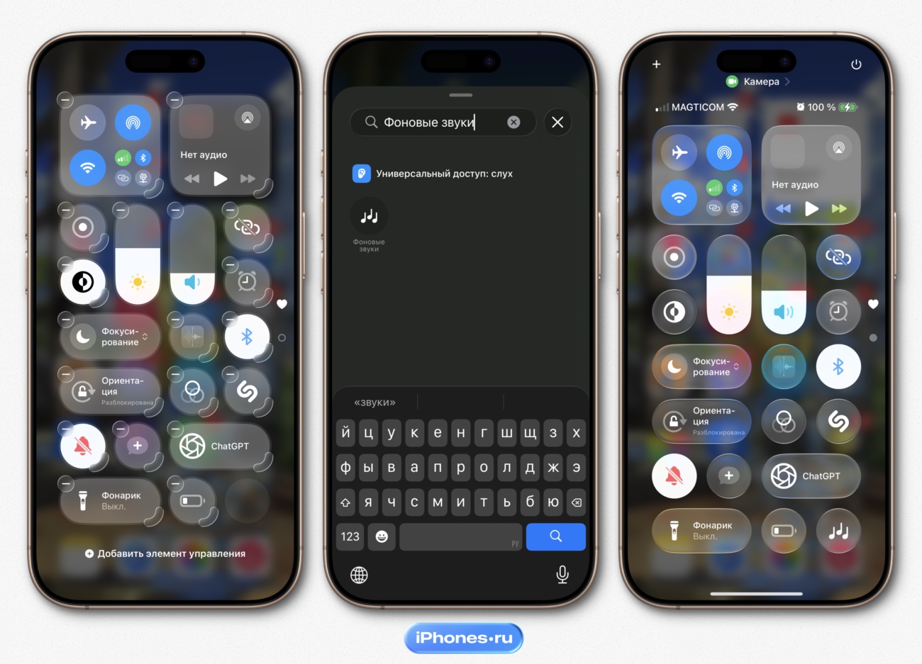 1. Откройте Пункт управления → зажмите палец на пустом месте → нажмите + Добавить элемент управления → в поиске введите Фоновые звуки → выберите кнопку Фоновые звуки.