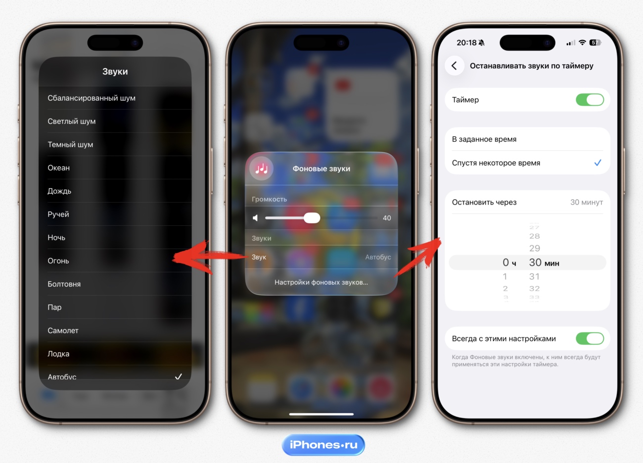 2. Если зажать кнопку Фоновые звуки в пункте управления, по касанию на строку Звук можно выбрать разные категории от океана до автобуса.