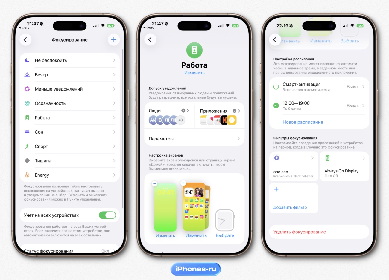 - Фокусирование делает iPhone «рабочим»: убирает уведомления, прячет лишние экраны, оставляет только нужные люди/приложения