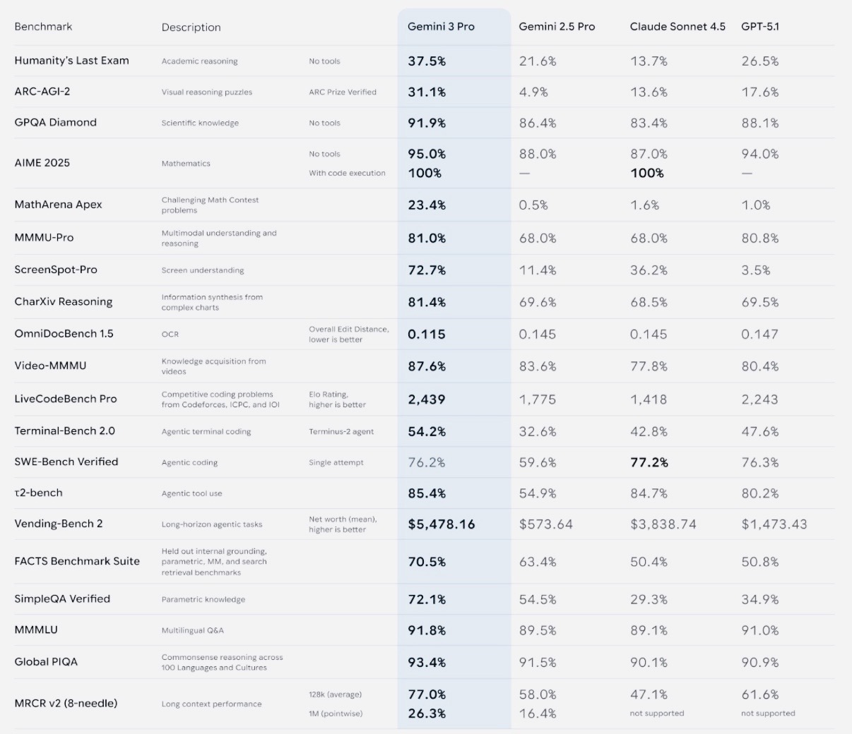 В SWE-Bench Verified Gemini 3 Pro отстаёт от Claude Sonnet 4.5 всего на 1%. В большинстве других тестов она выходит в лидеры. В ARC-AGI-2, который проверяет способность моделей извлекать правила из примеров и применять их в новых задачах, Gemini 3 Pro набирает 31,1% против 17,6% у GPT-5.1 Thinking.