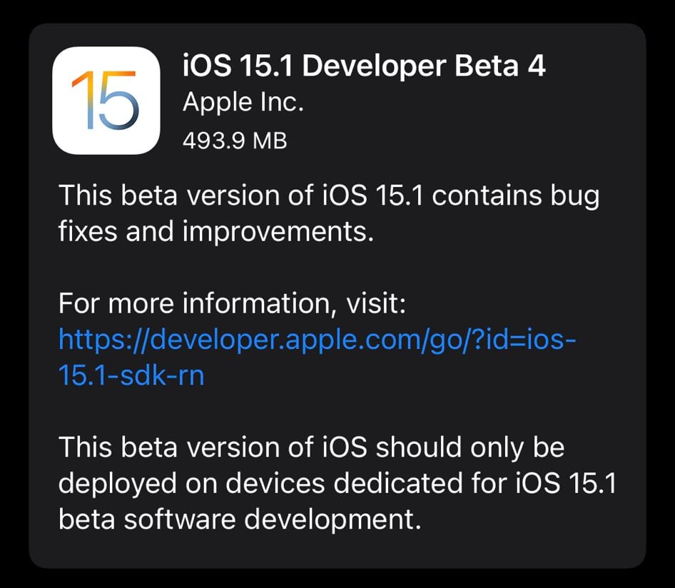 Apple выпустила четвертую бета-версию iOS 15.1 для разработчиков.