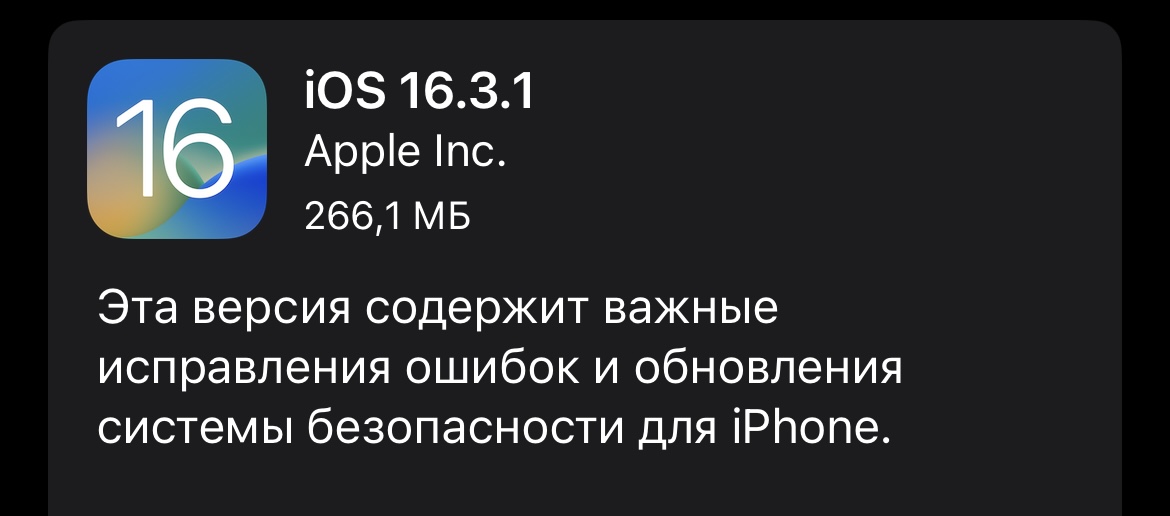 Размер ПО — около 400 МБ. Скачать iOS 16.3.1 можно в меню Настройки -> Основные -> Обновление ПО.