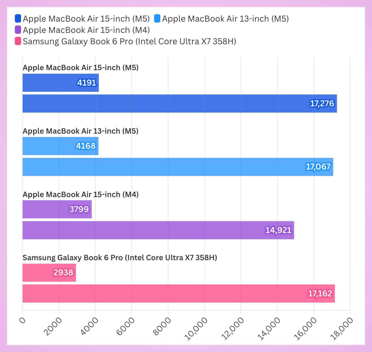 Главное изменение в новом MacBook Air — процессор M5. В тесте Geekbench он уверенно обходит версию с чипом M4.