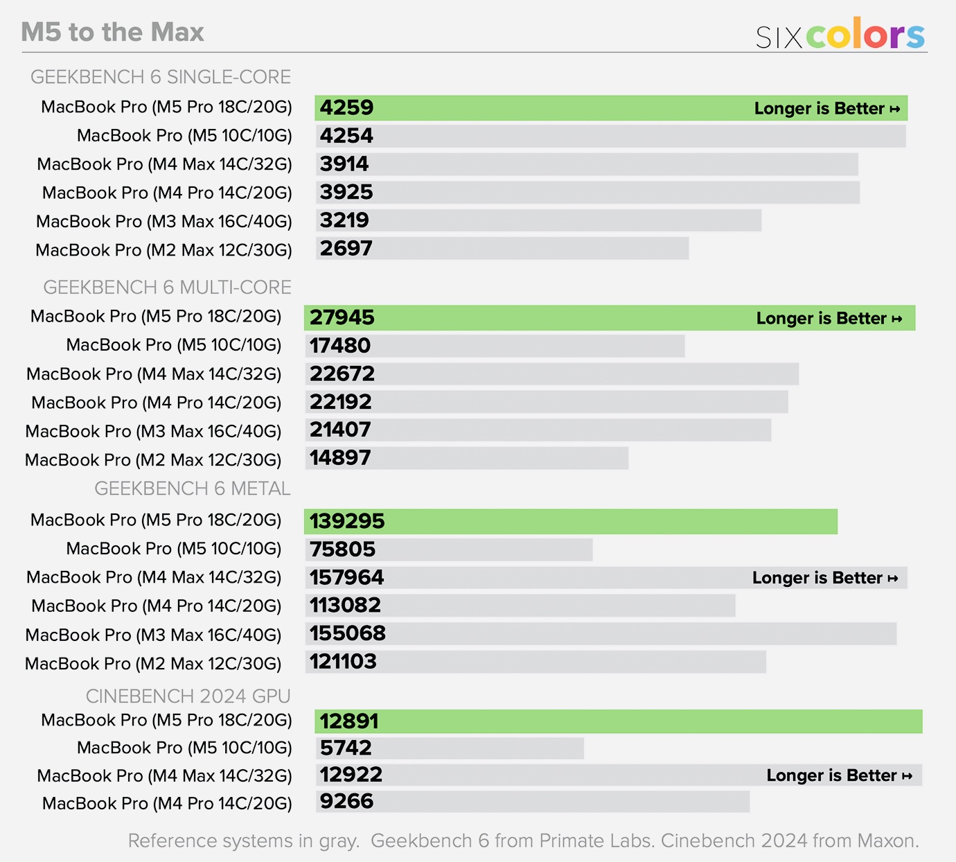 Ядро CPU в M5 примерно на 15% быстрее поколения M4. А MacBook Pro журналиста на M5 Pro оказался на 23% быстрее, чем его собственный ноутбук на M4 Max.