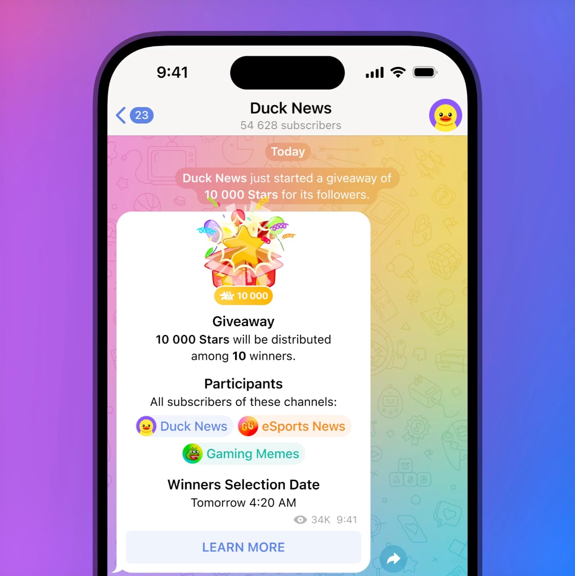 Владельцы каналов могут разыгрывать Telegram Stars, внутреннюю валюту Telegram, которая используется в мини-приложениях, реакциях и для доступа к скрытым медиафайлам.