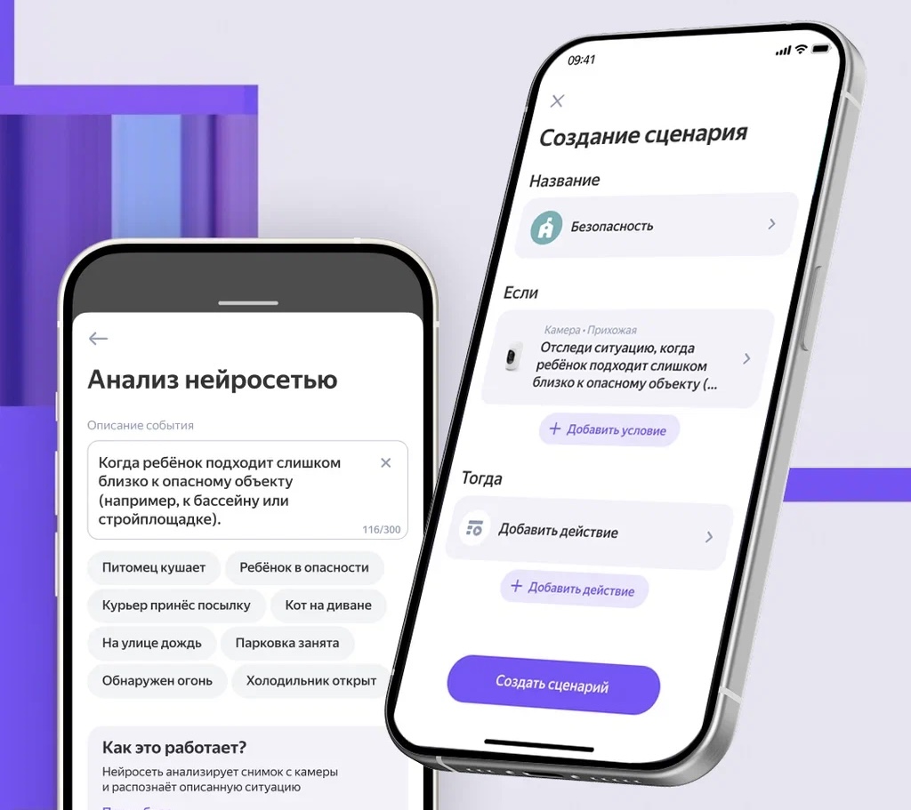 Камера также позволяет задавать условия для сценариев умного дома обычными словами. Пользователь описывает ситуацию в свободной форме (например, «собака грызёт диван») и выбирает действие в ответ в приложении «Дом с Алисой».