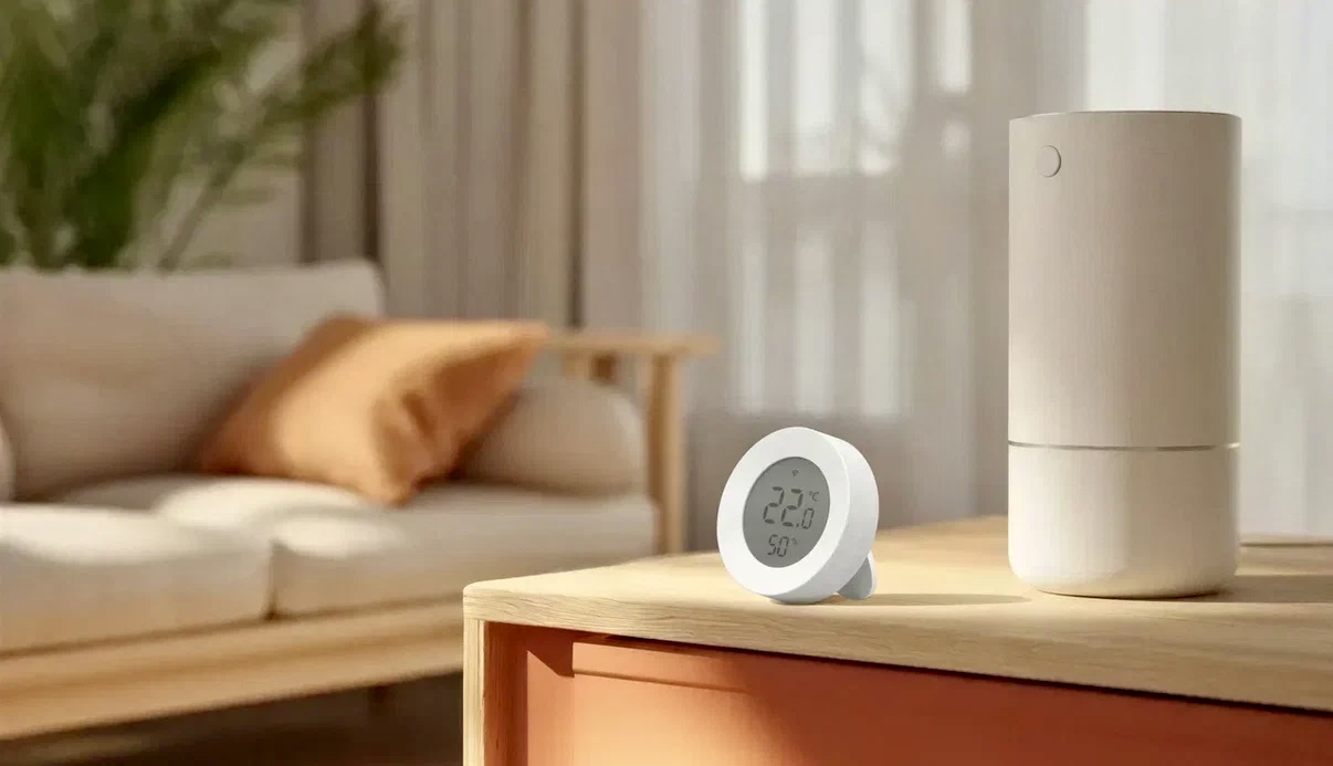 Он используется в сценариях автоматизации: например, включает кондиционер при 25°C или увлажнитель при падении влажности до 40%.