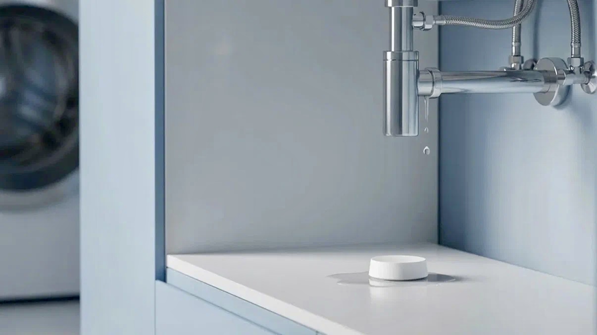 Датчик протечки теперь в новом корпусе. Он фиксирует появление воды и отправляет уведомление.