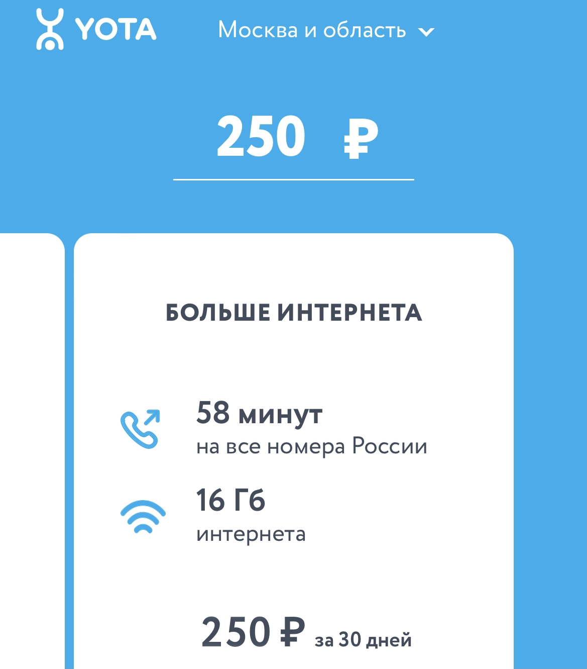 Например, за 250 рублей в Москве можно получить 170 минут и 1 ГБ интернета или 58 минут 16 ГБ интернета.