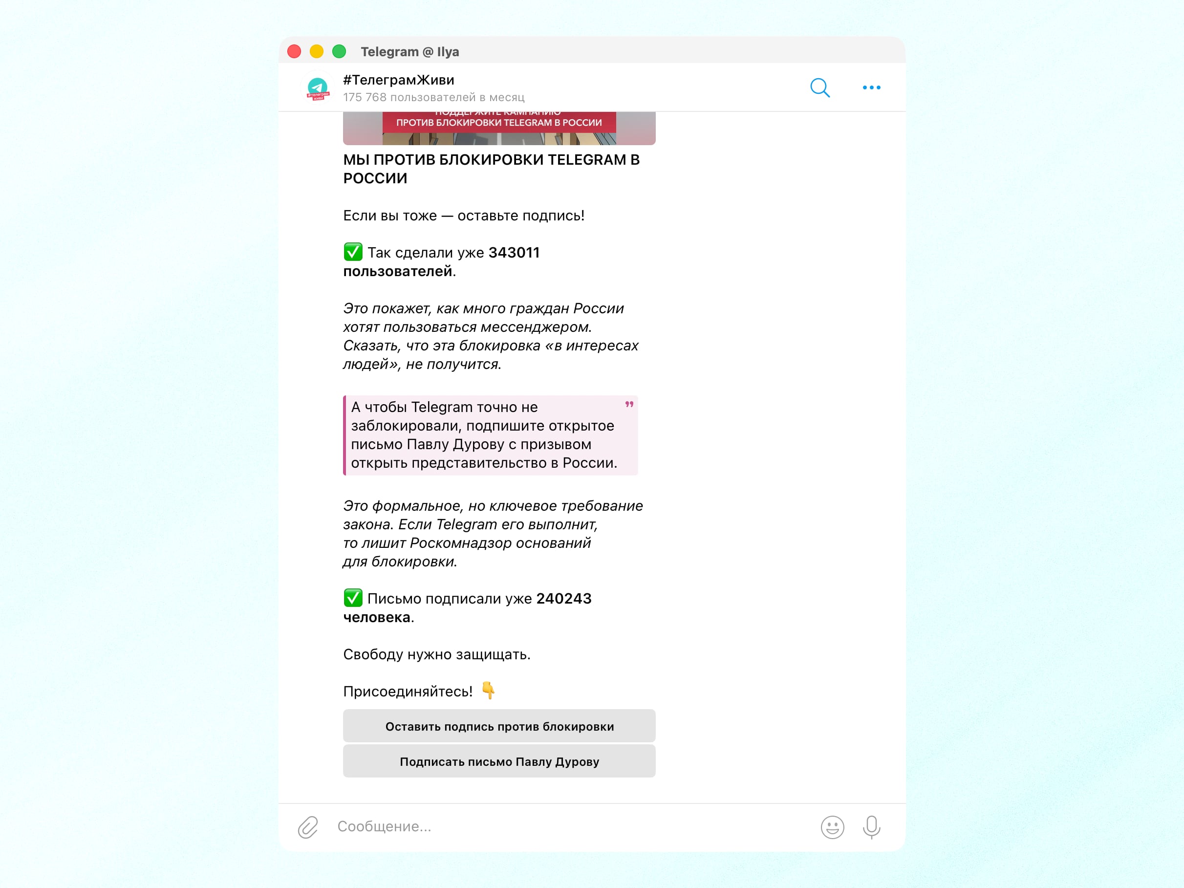 В этом же боте можно подписать открытое письмо к Павлу Дурову с призывом открыть представительство Telegram в России. Под этим подписалось 240 тысяч человек.