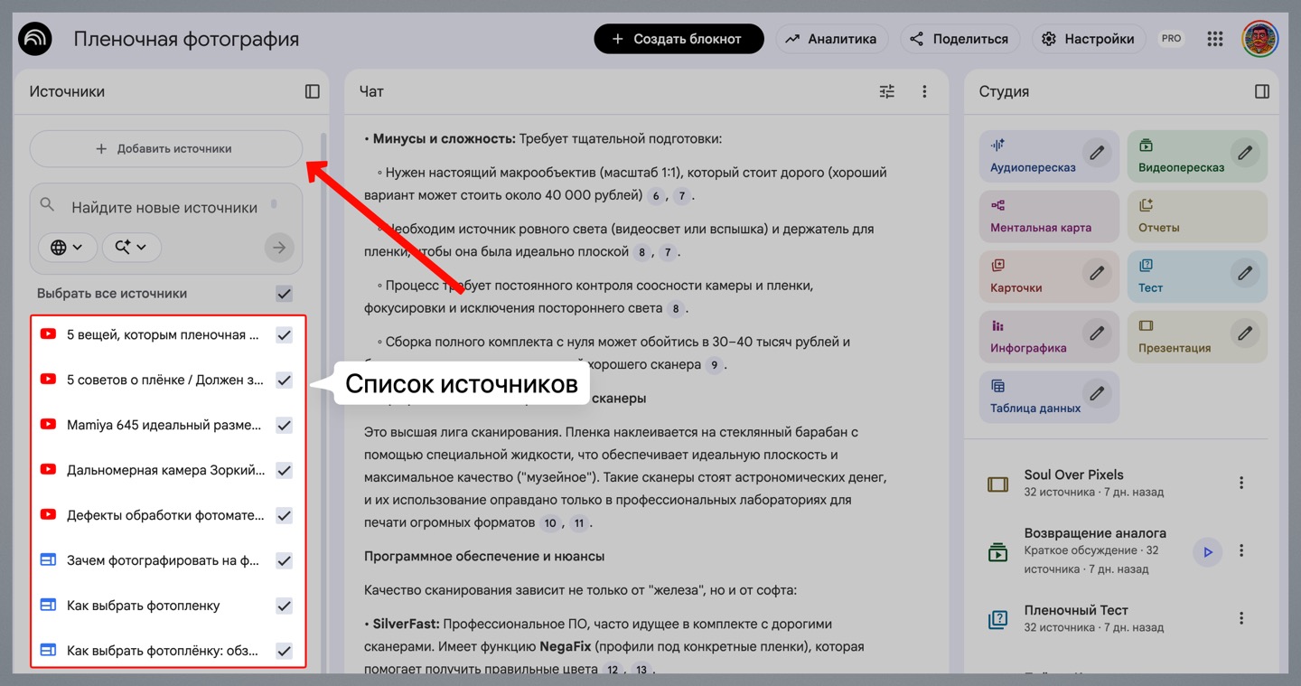Недавно я начал изучать пленочную фотографию и, чтобы быстрее погрузиться в тему, решил использовать NotebookLM — это бесплатный ИИ от Google, который здорово помогает в обучении и может сам делать видео.