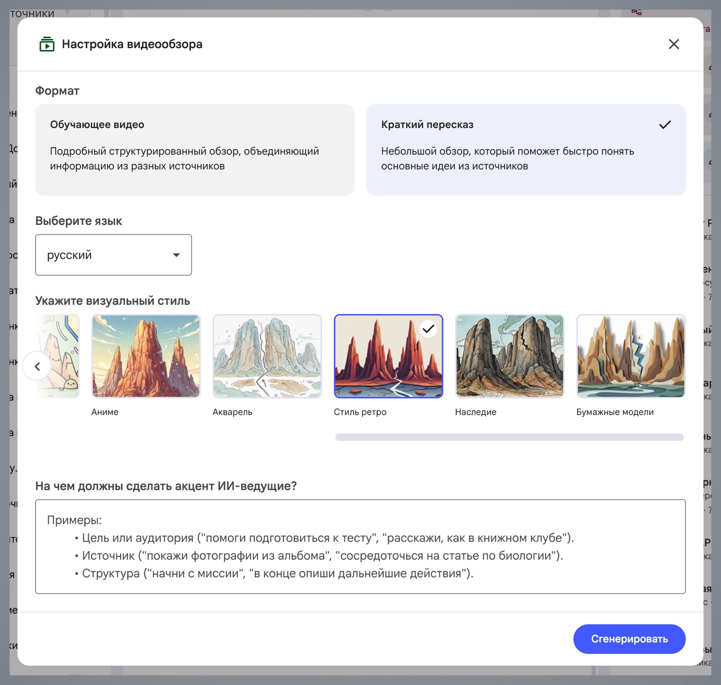 2. Выберите стиль видео (маркерная доска, каваий, аниме, ретро, акварель, наследие, бумажный) либо оставьте это на усмотрение ИИ.