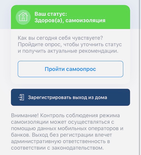 В нем нужно заполнить анкету о состоянии здоровья и статусе нахождения дома. Для выхода из дома требуется QR-код, который также можно оформить внутри программы.