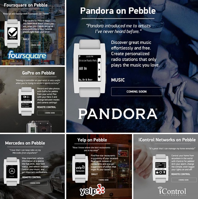 Обновлено: Только что стало известно, что у Pebble будет еще один анонс, на сей раз софтверный. В ближайшем будущем появится множество приложений для смартчасов от именитых брендов, полюбуйтесь:
