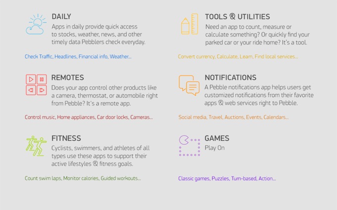 Похоже, что Pebble App Store будет во многом напоминать одноименный онлайн-магазин, встроенный в iOS. Там можно будет найти категории «Лучшее за день», «Пульт управления», «Игры» (!), «Оповещения», «Твики», «Утилиты», «Фитнес» и, конечно, заставки.